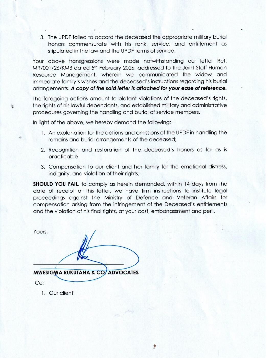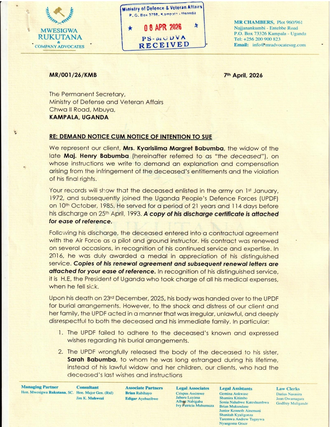 Maj. Babumba, who died on 23rd December 2025, had been entrusted to the UPDF for burial arrangements. However, a legal notice issued through Mwesigwa Rukutana & Co. Advocates alleges that the army mishandled the remains in a manner described as “irregular, unlawful, and deeply disrespectful.”